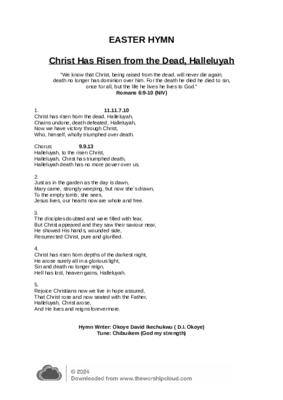 The Easter Hymn of Triumph, composed by Nigerian hymn writer Okoye David Ikechukwu, officially known as D.I. Okoye, is a resounding anthem celebrating the resurrection of Jesus Christ. With fervent praise and exultation, this hymn magnifies the victory of Christ over sin and death, echoing the timeless message of redemption and hope found in the Easter story.