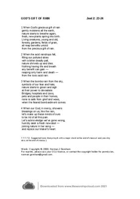 This hymn for children (and adults) celebrates God's gift of rain, laments the devastation we have caused on earth and pleads for a fresh new start.
