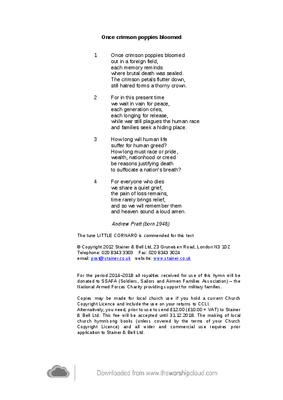 For the period 2014–2018 all royalties received for use of this hymn will be donated to SSAFA (Soldiers, Sailors and Airmen Families Association) – the National Armed Forces Charity providing support for military families. Copies may be made for local church use if you hold a current Church Copyright Licence and include the use on your returns to CCLI. Alternatively, you need, prior to use to send £12.00 (£10.00 + VAT) to Stainer & Bell Ltd. This fee will be accepted until 31.12.2018. The making of local church hymn/song books (unless covered by the terms of your Church Copyright Licence) and all wider and commercial use requires prior application to Stainer & Bell Ltd.