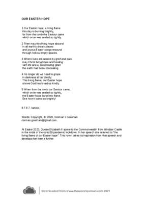 At Easter 2020, Queen Elizabeth II spoke to the Commonwealth from Windsor Castle in the midst of the covid-19 pandemic lockdown. In her speech she referred to “the living flame of our Easter hope”. This hymn takes its inspiration from that speech and develops her theme further.