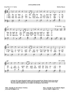 At Easter 2020 Queen Elizabeth II spoke to the Commonwealth from Windsor Castle in the midst of the covid-19 pandemic lockdown. In her speech she referred to "the living flame of our Easter hope". This hymn takes its inspiration from that speech and develops her theme further. Here it has the tune Living Flame by Madeline Maguire to enhance the words.