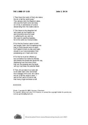 This hymn recalls the oblique reference to the Baptism of the Lord as described in the Fourth Gospel, as well as the Baptist's testimony to Christ as the Lamb of God The first two verses echo the wording of the Agnus Dei.