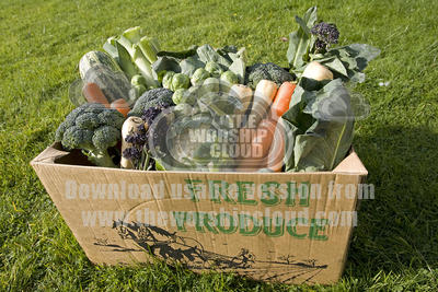 Cardboard box of fresh locally grown vegetables including cauliflower, cabbage, carrots, srouts, purple sprouting, parsnips and marrow