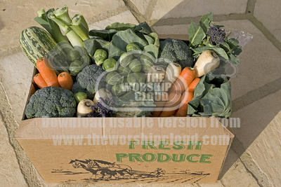 Cardboard box of fresh locally grown vegetables including cauliflower, cabbage, carrots, srouts, purple sprouting, parsnips and marrow