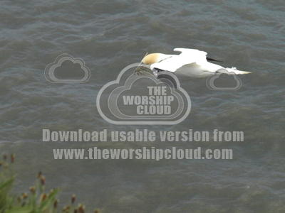 Gannet flying with nesting material over the sea, you can clearly see seaweed in its beak as it soars along the cliff edge.