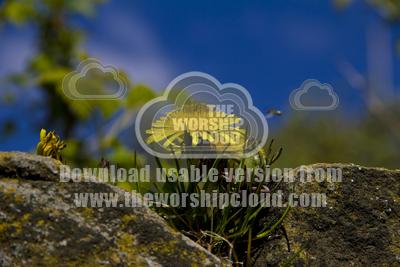 A gorgeous yellow dandelion growing on a rustic old stone wall