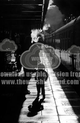 People waiting at a train station platform. Waiting for a train, friends to arrive or saying goodbye. A lone child walks along the platform, looking for someone, lost or is she just intrigued?
