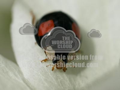 A black ladybird with red spots on a white flower petal. A black ladybird with red spots on a white flower petal.