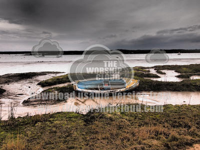a chromatic image of an open boat abandoned in the saltmarsh