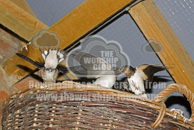 Adult female swallow Hirundo rustica feeding fledgling on basket in roof Cotswolds UK