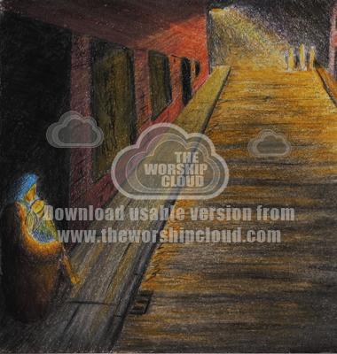 A homeless couple with newborn child shelter in a doorway whilst three figures stand at the end of theroad looking on