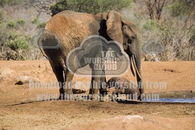 African Elephant cow Loxodonta africana trying to rescue her very young calf which has fallen into a water hole in Ngulia Rhino Sancturay Tsavo National Park West Kenya