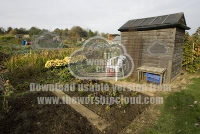 Allotment plot with shed empty chair and green vegetables Chipping Campden Cotswolds UK