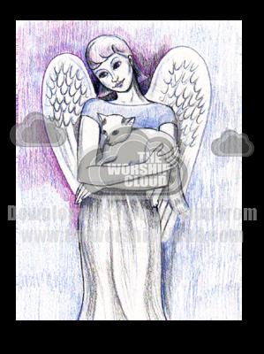Coloured pencil drawing of my white cat in the arms of an angel. By Artist Audrey Hogan