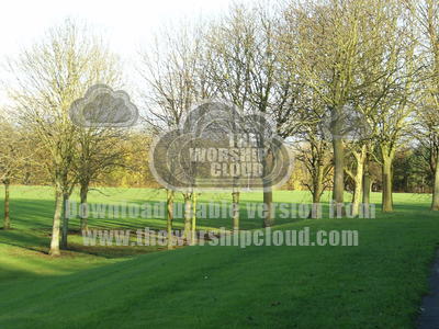 At a distance you can see the trees with branches reaching up to the sky, and casting long shadows, as evening draws in on a November evening.Digital photograph taken by Audrey Hogan at Forest Park Warrington Cheshire UK