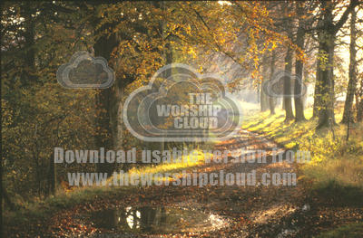 Sunlit autumn path with reflections