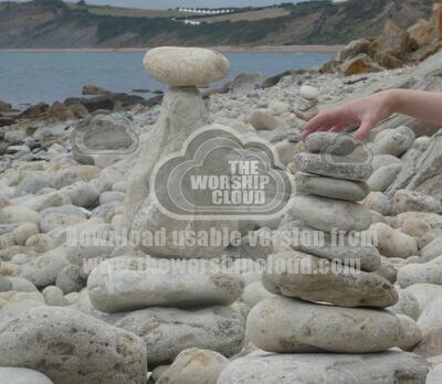 Skilled balancing of rocks to make a pillar on the beach at Osmington Mills, Dorset