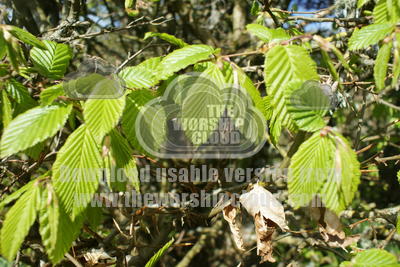 A twig of beech leaves opening in April,against a hedge with some dead leaves still hanging.