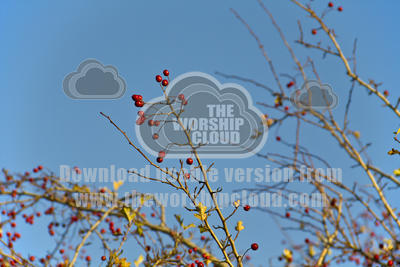 Hawthorn berries bright red against a blue Autumn sky