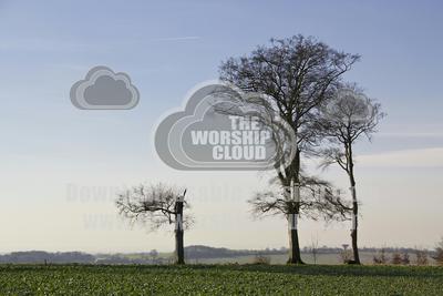 A stunted tree looks up at its two neighbours all dark branches in the winter sun