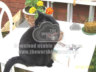 My black cat Ebony sitting pretty on the garden table with a plant.