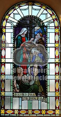 Traditional stained glass window in St Johns Methodist Church Hayfield depicting the beatitude “Blessed are the merciful.