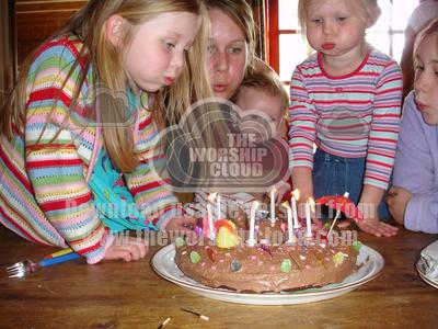 Faith, her mother and her sisters blowing out the cadles on the birthday cake at her sixth birthday party