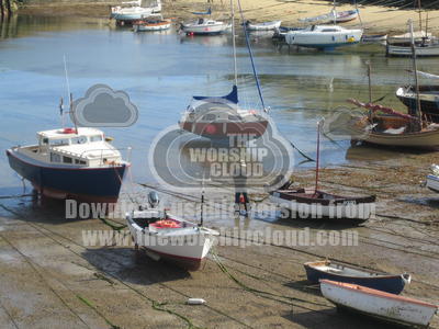 Boats in dock, with lonely figure in middle. Mousehole, Cornwall