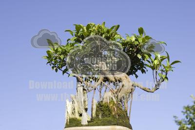 Bonsai fig tree. Note air roots, artistic shape and rocks included in display.