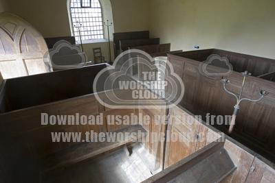 Box pews inside St Mary's church in Little Washbourne some 6 miles south of Evesham. This is a tiny 12th century church consisting of nave, chancel & bell turret. It is now adminstered by The Churches Conservation Trust. The church has 18th century furnishings with unusal box pews a fine altar table, and a high pulpit. It is situated in an Isolated position surrounded by orchards & Cotswold views.