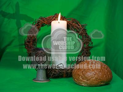 Image suitable for a PowerPoint slide. The bread and wine with a single candle that has the face of Christ added to one side. Framed by a crown of thorns with the shadow of the empty cross in the background.