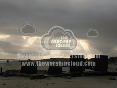image of sunlight breaking through clouds on a sandy beach with concrete blocks in the foreground