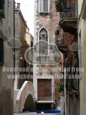 Bridge linking narrow passageways in Venice with boat outside house.