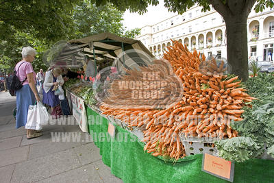 Carrots for sale at Farmers Market on promenade, Cheltenham, UK