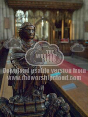 A carved pew end in trinity church Hull, set against a backdrop of the interior