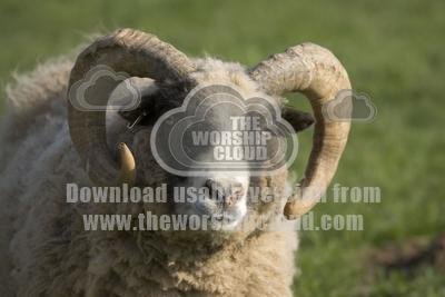 • Head and horns of Shetland sheep ram Rare Breed Trust Cotswold F