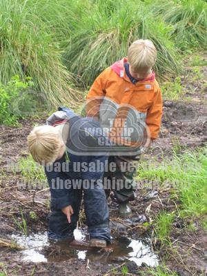 Children, well protected, in puddle