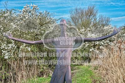 Statue of Christ from Launde Abbey superimposed on Spingtime landscape with hedgerows in blossom beside path.
