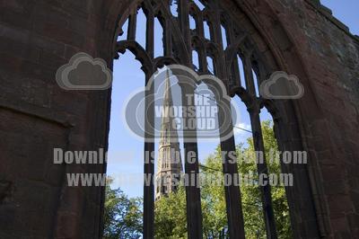 A distant spire of a Church taken through the window of another Church