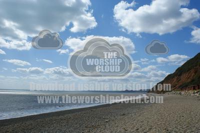 Branscombe beach, Devon, with white clouds in blue sky