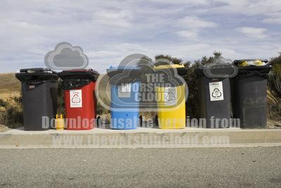 Colourful recycling bins at visitor centre near Lake Pukaki Mackenzie District New Zealand where the District Council supports a zero waste strategy