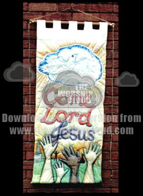 A quilted banner designed and made by Audrey Anne Hogan for a local church. It is based on the closing words of Revelation. Amen come lord Jesus. Arms are visualised reaching up to heaven and the presence of God manefested by a dove set in a cloud.It is like an invitation for the lord to come amongst us now as well as in His second comming.