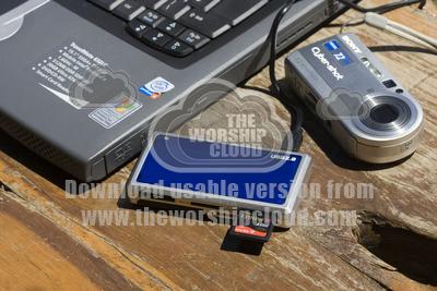Copying digital images from SD Smart card in USB 2 card reader to Acer Travelmate laptop computer on safri in Africa