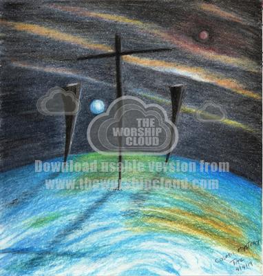 A surreal image of the cross and two nails hanging above the earth against a cosmic background