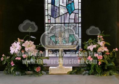 altar with silver cross and flowers