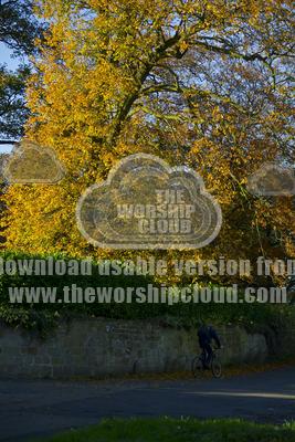A drab coloured cyclist homeward bound below a tree laden with Autumn gold