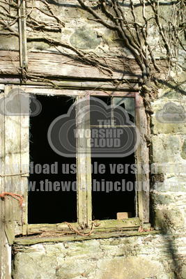 Decaying wooden window frame with missing / broken glass in outbuilding of old manor house in Devon