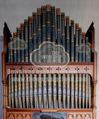 Decorative organ pipes on the front of a small Church organ