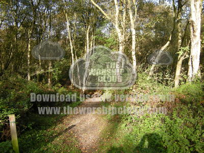 Deep in the heart of Risley Moss the sun is low in the sky and the path is uneven and winding. The trees topsy turvy at all angles. Mostly silver birch.Captured on digital camera by Audrey Hogan Oct 2009