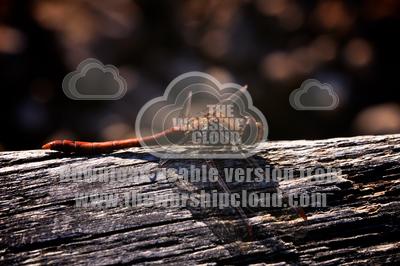 Dragonfly resting in the sun on a log.